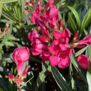 Le Nerium oleander se caractérise par ses feuilles persistantes, étroites et coriaces, disposées en verticilles. Ses fleurs, simples ou doubles selon les cultivars, s’épanouissent de juin à octobre, attirant pollinisateurs tout en résistant aux conditions arides. Parmi les variétés notables, on retrouve ‘Rosita’ (buissonnante dense), ‘Sister Agnes’ (fleurs blanches simples) ou ‘Ville de La Londe’ (fleurs rose-rouge simples éclatantes).